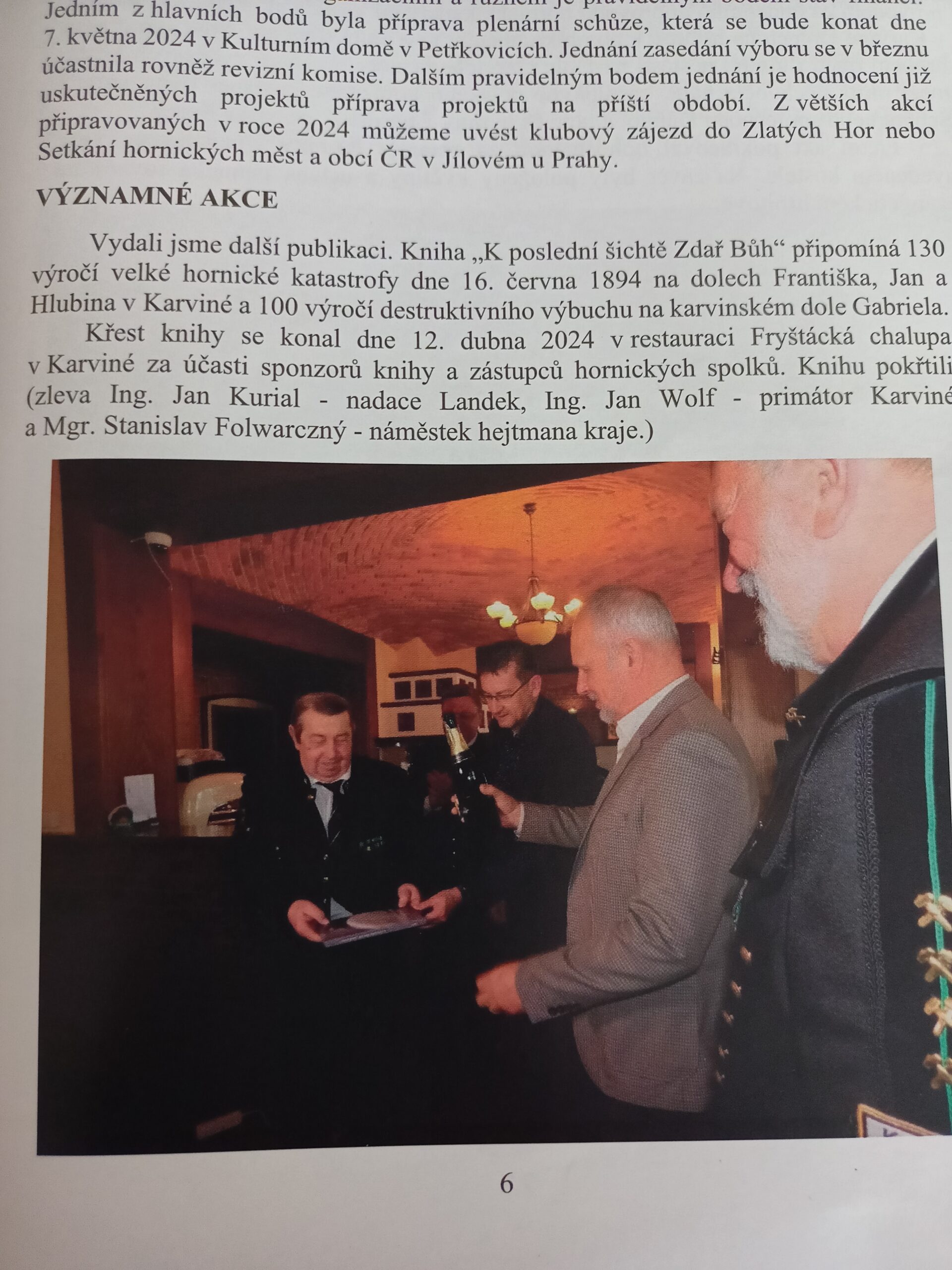 Pod záštitou Klubu přátel hornického muzea v Ostravě byly vydána kniha pod názvem K poslední šichtě Zdař Bůh ke 100 výročí mohutného výbuchu na Dole Gabriela a ke 130. výročí největší tragédie v revíru na Dolech Jan a Františka v Karviné, kde zahynulo 235 havířů. Vydání této knihy bylo umožněno díky sponzorským darům a mezi nejvýznamnější sponzory patřil Moravskoslezský kraj. Všem sponzorům děkujeme