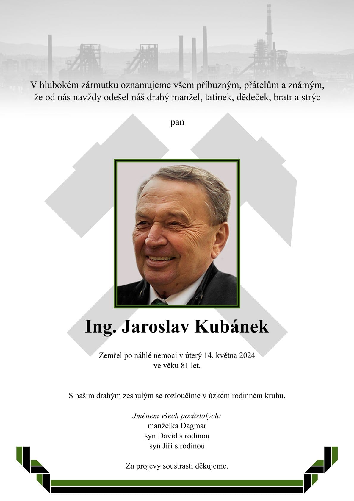 s politováním Vám sděluji smutnou zprávu, že dne 15.května 2024 náhle po krátké a těžké nemoci nás navždy opustil člen a tajemník Správní rady Nadace LANDEK Ostrava pan Ing. Jaroslav Kubánek. V jeho osobě ztrácíme významného a mimořádně pracovitého a obětavého kamaráda a spolupracovníka. Rozloučení proběhne v úzkém rodinném kruhu.
